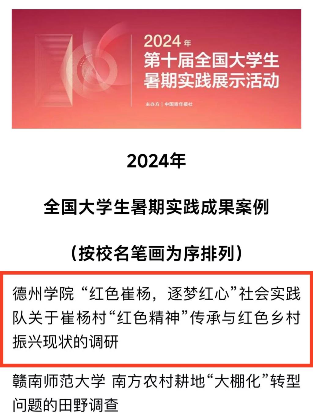 近日,2024年第十届全国大学生暑期实践展示活动案例发布。经校方推荐、团队自荐、网络展示等环节,红宝石官网娱乐网址“红色崔杨,逐梦红心”社会实践队脱颖而出,入选全国百强!