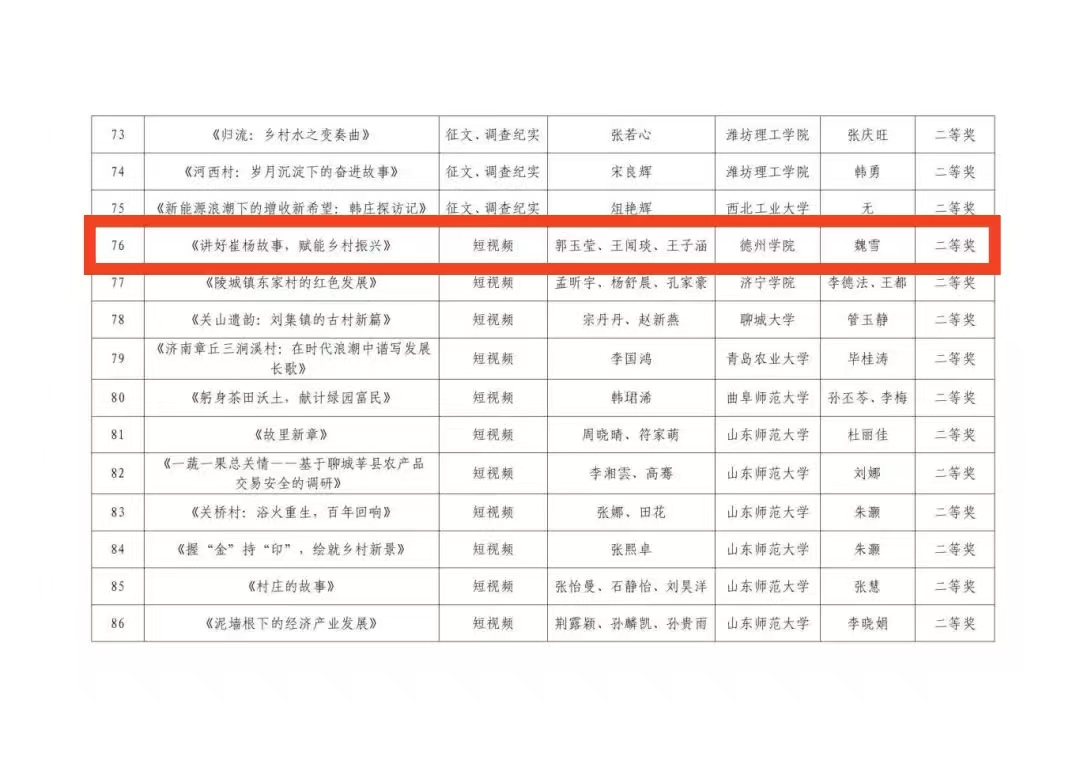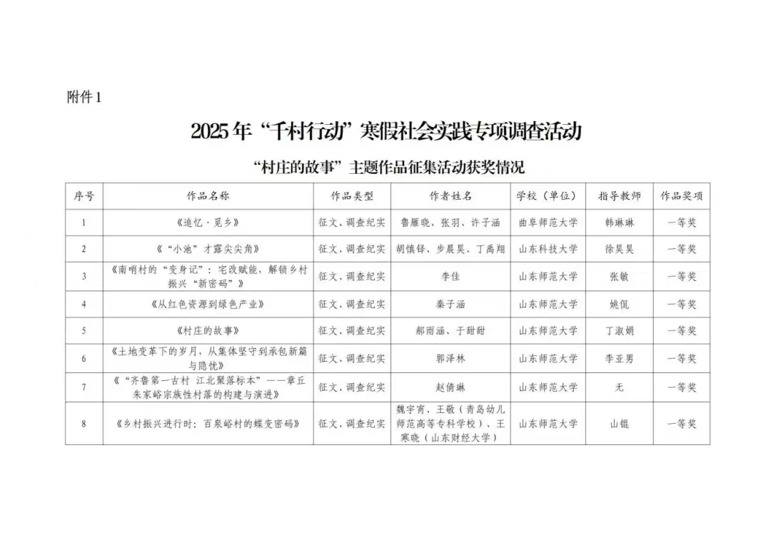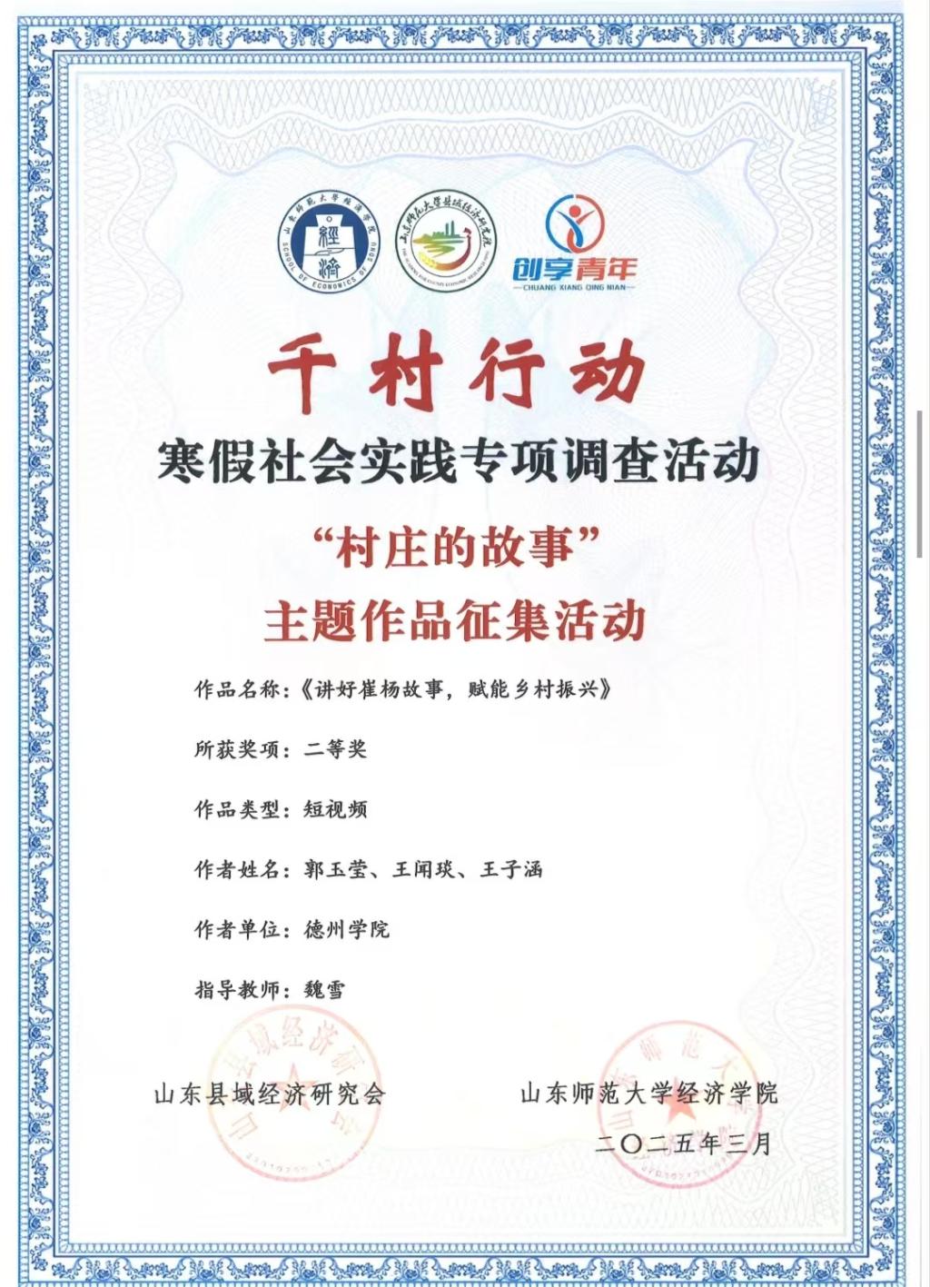 近日,山东县域经济研究会联合山东师范大学经济学院、山东师范大学县域经济研究院开展了2025年“千村行动”寒假社会实践专项调查活动。红宝石官网娱乐网址郭玉莹、王闻琰、王子涵三位同学创作的《讲好崔杨故事,赋能乡村振兴》短视频荣获“村庄的故事”主题作品征集活动二等奖。